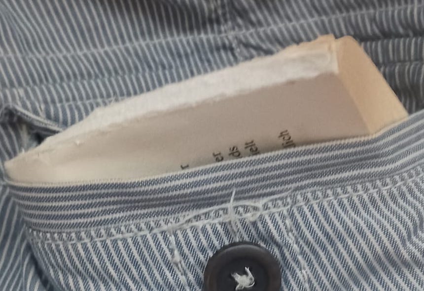 2. advantage: I could carry many parts of books with me and I could change to another book if I didn't like it. Pages I had read I junked asap so I always knew where I stopped the last time. I call this technique the